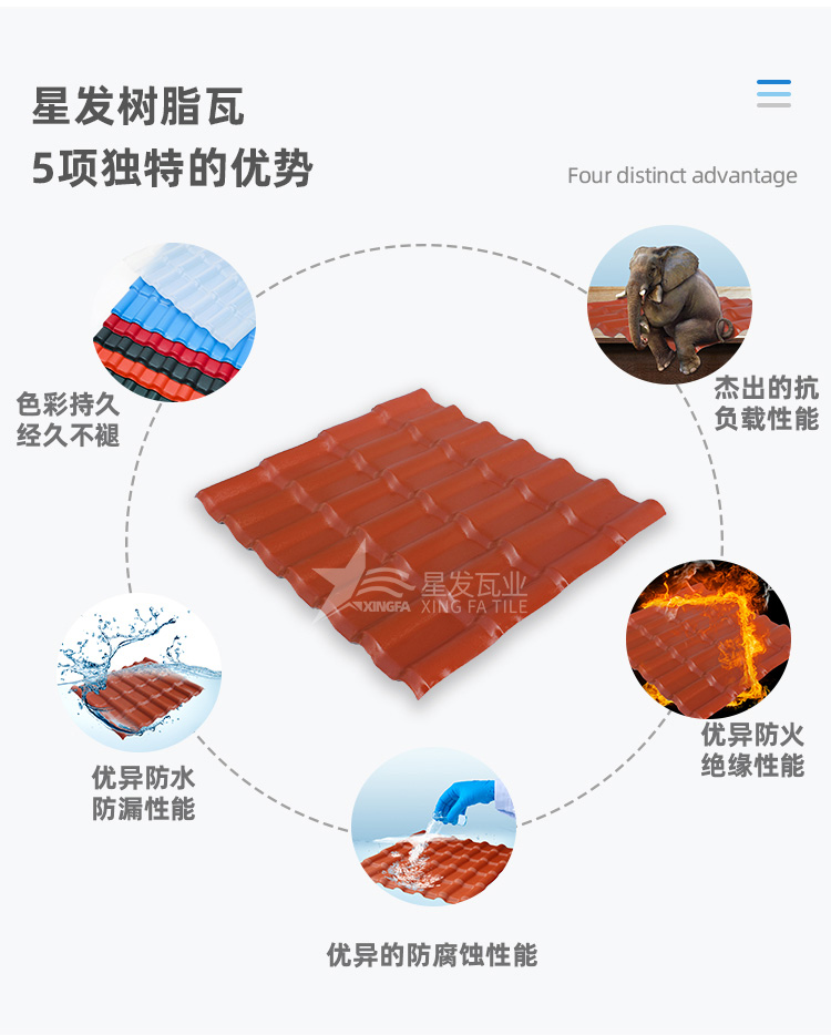 合成樹脂瓦色彩持久、造型美觀、具有中國建筑特色。采用超高耐候性工程樹脂ASA精制而成,擁有質輕、防水防火、保溫隔熱、抗腐蝕、堅韌耐用,安裝快捷等特點,簡直是屋面裝飾的最優選擇!使用壽命長達30年!